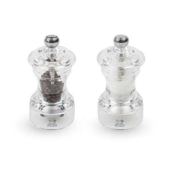 The Peugeot Bistro Duo 4" Acrylic Salt and Pepper Mill Set includes a 4" salt mill and a 4" pepper mill in sparkling French acrylic. This beautiful set makes an elegant addition to any table, and the high-quality acrylic won't crack or fog, keeping its beautiful finish over time.