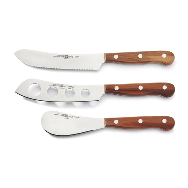 The Three-Piece Plum Charcuterie Knife Set by Wusthof is an elegant set ideal for entertaining. Serve a show-stopping charcuterie board with this 5.5" Sausage Knife, 4" Pate Knife and 5.5" Soft Cheese Knife. Each piece in this set has a full-tang blade that is laser-cut from high-carbon stainless steel in Solingen, Germany. These remarkable blades hold their edge and are easy to sharpen.