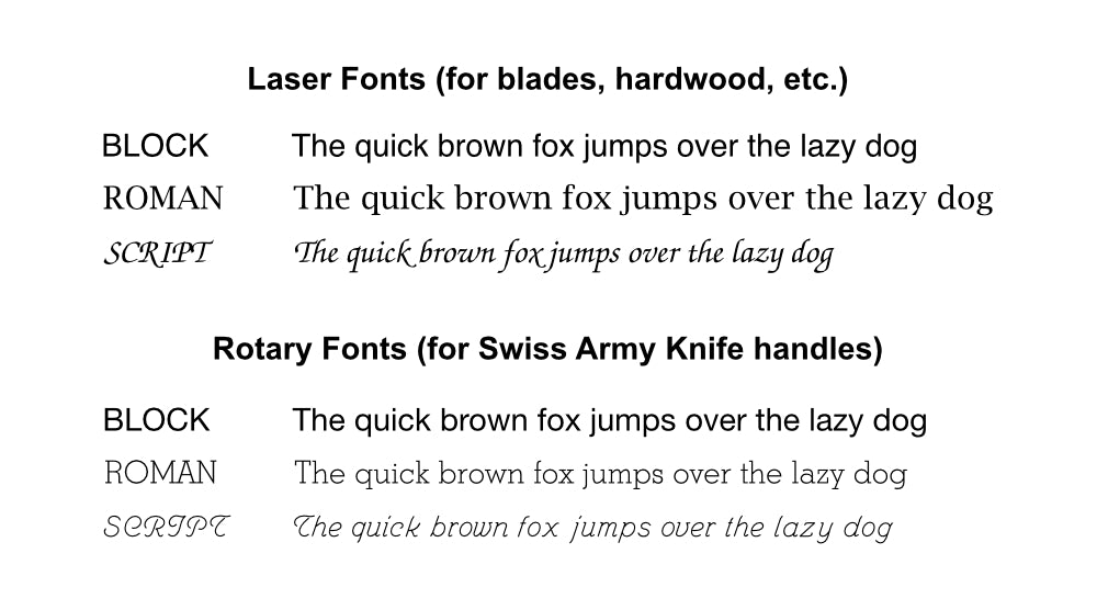 Many of the Swiss Army Knives and similar tools offer a font color selection, as our engraver carves out the letters and then applies a fill to make the engraving more visible. We offer white or silver fill. Both colors are popular options, and it's a matter of personal taste.