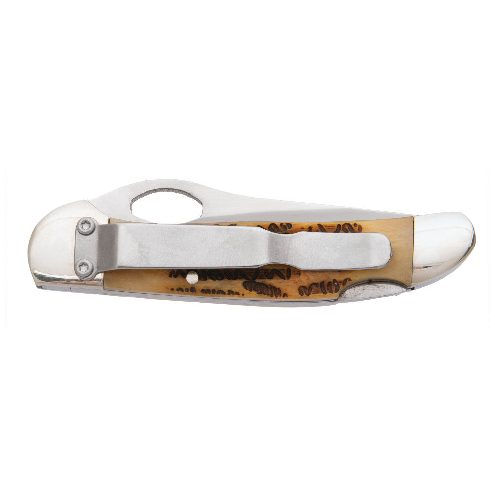 Features of the Bear and Son 5149L One-hand Opening Cowhand Genuine India Stag Bone Lockback Knife with Pocket Clip: