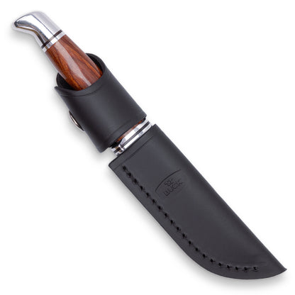 The Buck 102 Woodsman Heritage 100 Knife was designed to be the ultimate hunting knife. Its clip-point blade is ideal for fish and small game, and its full tang construction ensures it will stand up to serious use over time. A finger guard is integrated into the blade to keep your fingers safe and prevent them from sliding onto the blade accidentally, even in wet conditions. Thumb grip ridges also add to a secure grip.
