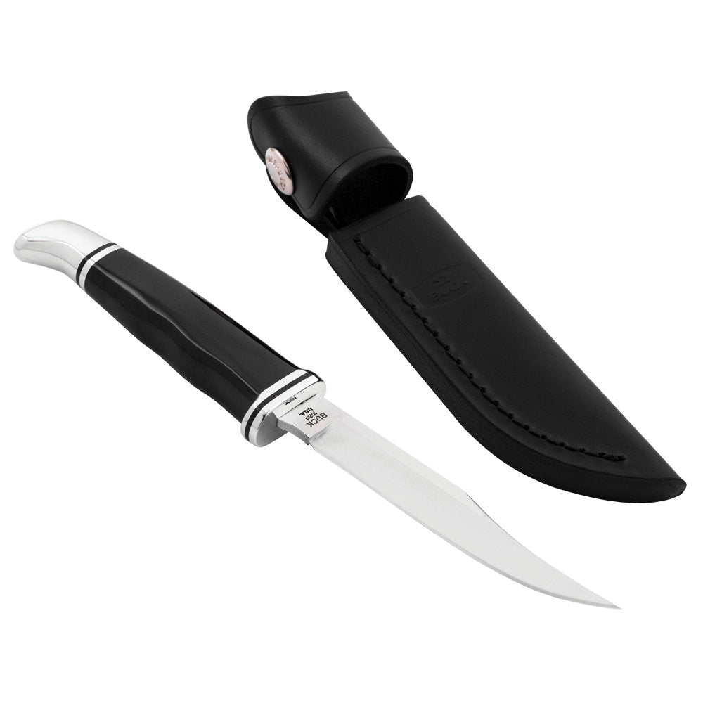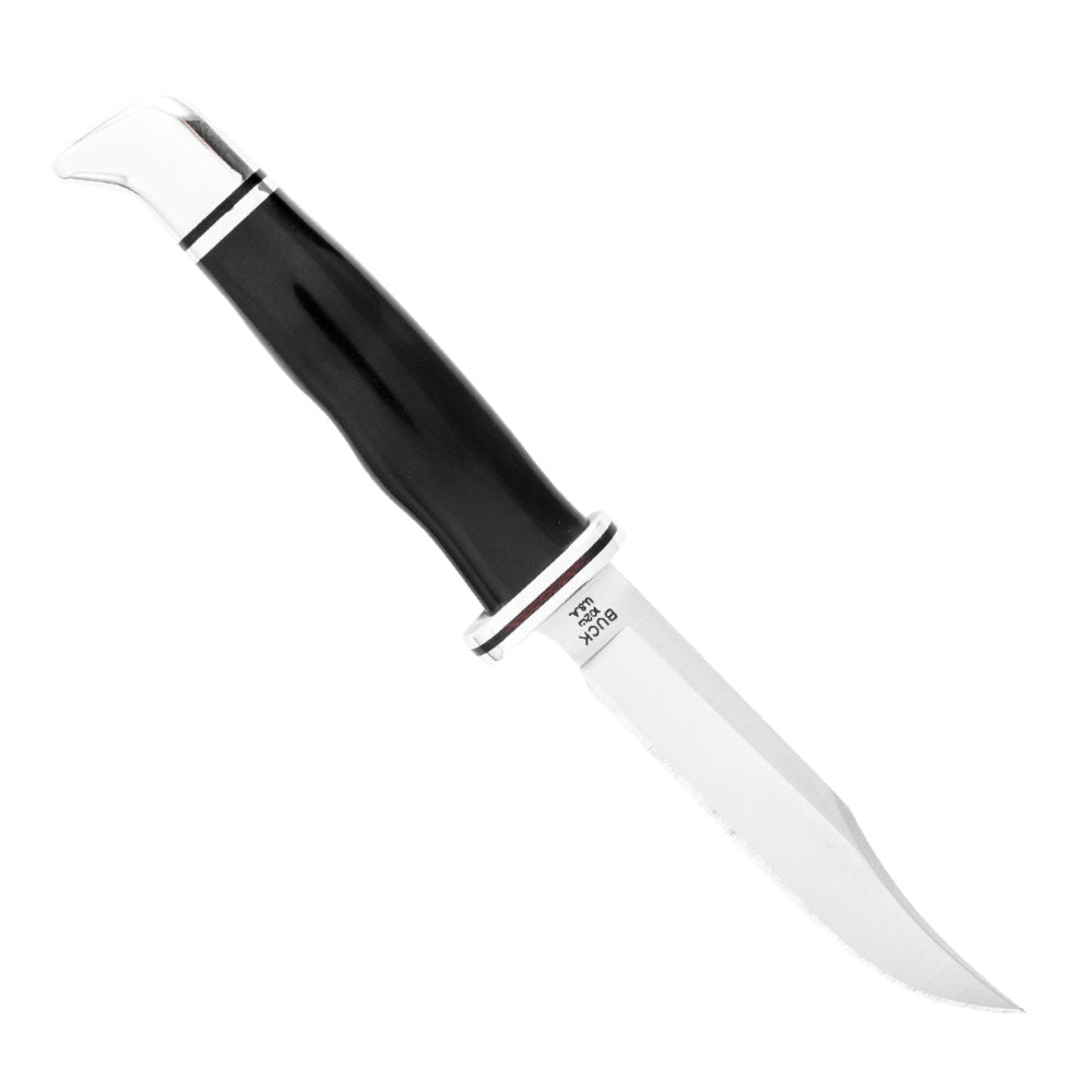 • The Buck 102 Buck Woodsman Knife was designed to be the ultimate hunting knife. Its clip-point blade is ideal for fish and small game, and its full tang construction ensures it will stand up to serious use over time. A finger guard is integrated into the blade to keep your fingers safe and prevent them from sliding onto the blade accidentally, even in wet conditions. Thumb grip ridges also add to a secure grip.