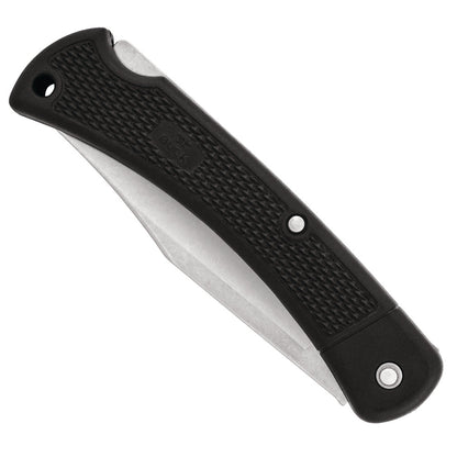 When opened fully, the 3.75-inch blade on the 110 Hunter LT locks safely into position with a lock back design. The lock is released by pushing down on the rocker visible on the top of the knife and folding the blade closed.