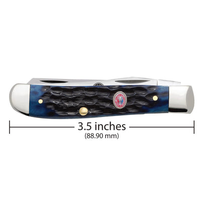 The Case Eagle Scout Mini Trapper Jigged Navy Blue Bone Pocket Knife is an officially licensed commemorative knife celebrating the Boy Scout's of America's Eagle Scout rank, the highest honor a scout can earn. This special knife has an inlay of the Eagle Scout insignia in the navy blue bone handles, as well as an engraving of the insignia on the clip blade. To make this gift even more special, it comes housed in a unique gift tin.