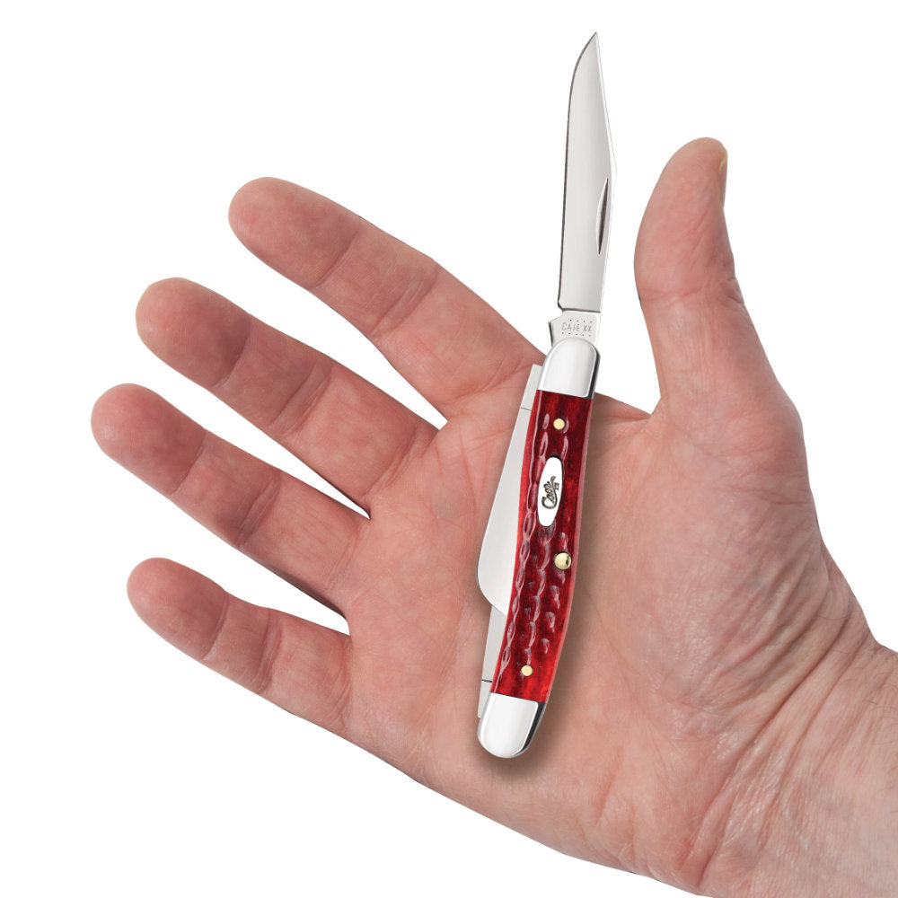 The Pocket Worn Old Red Bone handles of this Medium Stockman knife are finished with a corn cob jig pattern, and the front has an inlaid metal Case Knives shield. As the bone is a natural material, the handles of each of these knives are all unique and may not exactly match the image.
