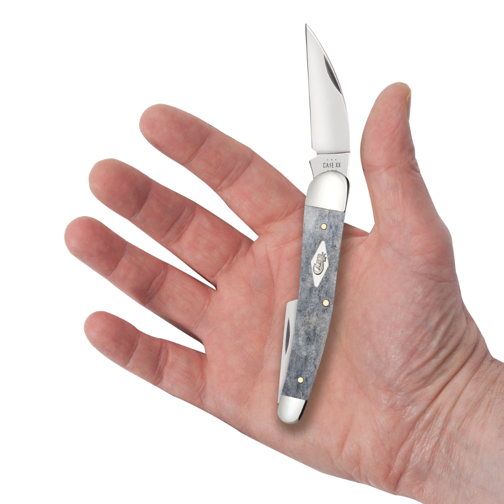 The Case Seahorse Whittler Smooth Gray Bone Knife is a model exclusive to Case. It includes an assortment of blades perfectly suited for whittling. The large wharncliffe blade, which is made of heavy-gauge steel, is located on one end of the knife alone and gives the knife a seahorse-like shape when opened. At the other end of the handle are a pen blade and a coping blade for detail work.