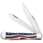 • The Case Trapper Star Spangled Knife is a timeless model originally designed for hunting and trapping. The natural bone front handle is embellished with the pattern of a waving flag, celebrating the spirit and history of America. The back handle is a natural bone white.