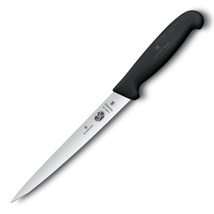 The Victorinox Fibrox Pro 7-inch Straight, Flexible Blade Fillet Knife by Victorinox features a Fibrox handle and extremely sharp blade that holds its edge.