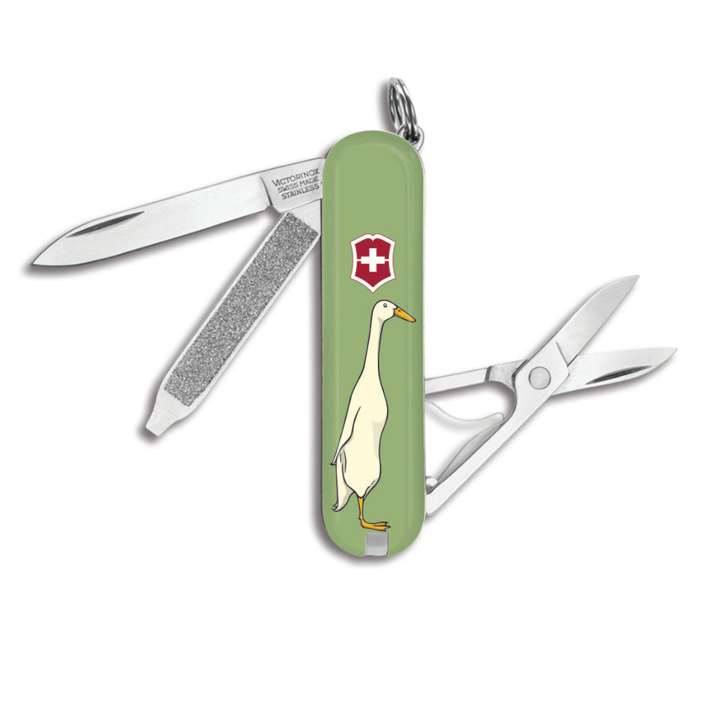 The Gaggle of Geese Classic SD Swiss Army Knife by Victorinox is a Swiss Knife Shop Design Studio creation featuring an adorable lineup of geese. The back of this Swiss knife has the SKS logo, as this keychain tool is our own design.