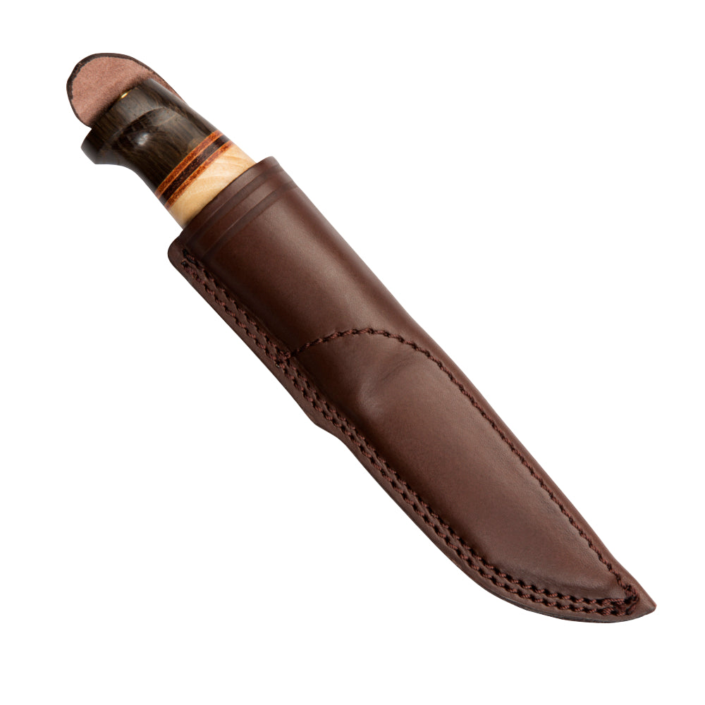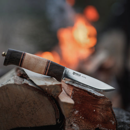 The Helle Harding Knife is an elevated version of a traditional barrel handle hunting knife. Its beautiful, warm handle is crafted from curly birch and darkened oak with layers of leather that have all been sanded to a barrel shape and polished by hand.
