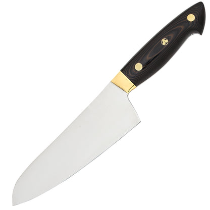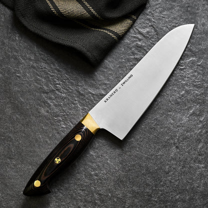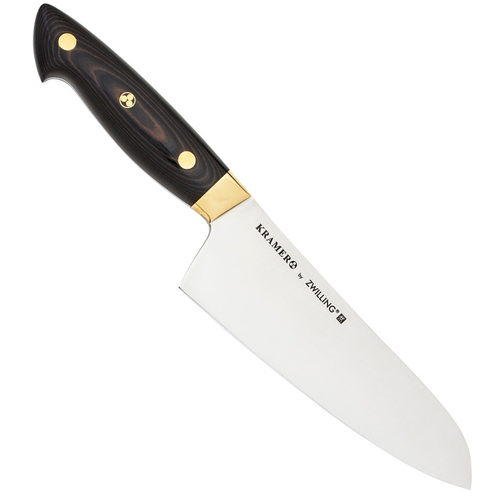 The handle of each Kramer Carbon Collection knife is hand-finished, lustrous Micarta, and features brass rivets and a mosaic pin crafted by Bob Kramer in his Washington state workshop. These beautiful handles are crafted to mirror the shape of your palm for comfort and ease of use, and highlight the beautiful, fully rounded and mirror polished spine and choil (where the blade meets the handle) of the knives.THE KRAMER 7-INCH CARBON STEEL SANTOKU KNIFE BY ZWILLING