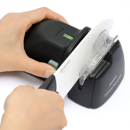 The Kyocera Mini Electric Knife Sharpener for Ceramic and Steel Knives is a battery powered knife sharpener featuring a #600-grade diamond wheel grinding stone that can removes nicks of up to 0.5mm from knife blades, restoring the blade angle to 35-degrees. A knife guide slot and assist roller assure you get the perfect angle on your knife blade each time, and prevent over-sharpening.