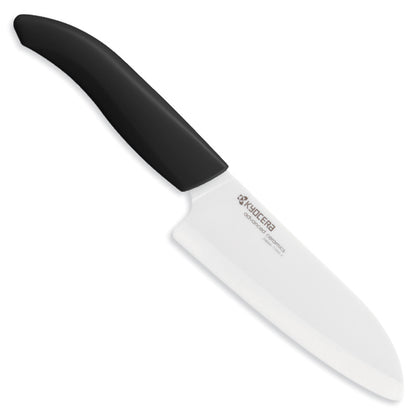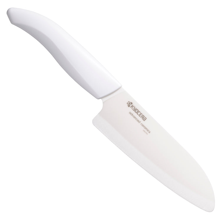 The Kyocera Revolution Series Ceramic 5.5" Santoku Knife features a razor-sharp, exceptionally strong, lightweight ceramic blade. This ceramic blade, made from Kyocera's proprietary Japanese ceramic, zirconium oxide, is inert, and will not discolor food or alter its taste. In addition, the blade will never rust, corrode or pit. Made of ceramic that is ground very fine and highly polished, it will retain its sharpness at least 10 times longer than any other blade - including one made from high carbon steel.