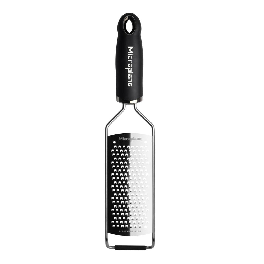 The Microplane Gourmet Series Coarse Grater is a hand-held grater designed specifically for grating hard cheeses, and chocolate, as well as hard fruits and vegetables such as carrots and coconuts.