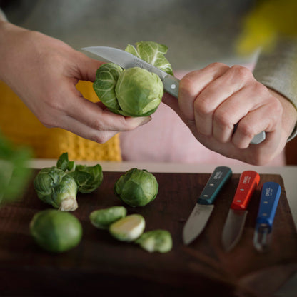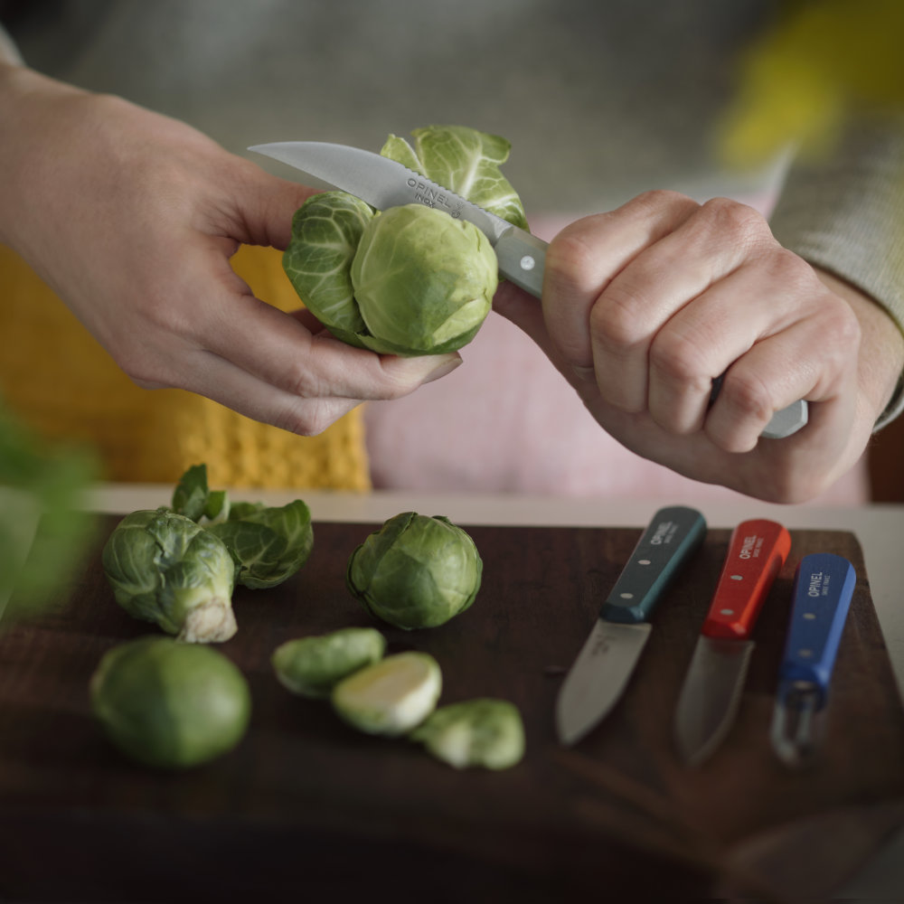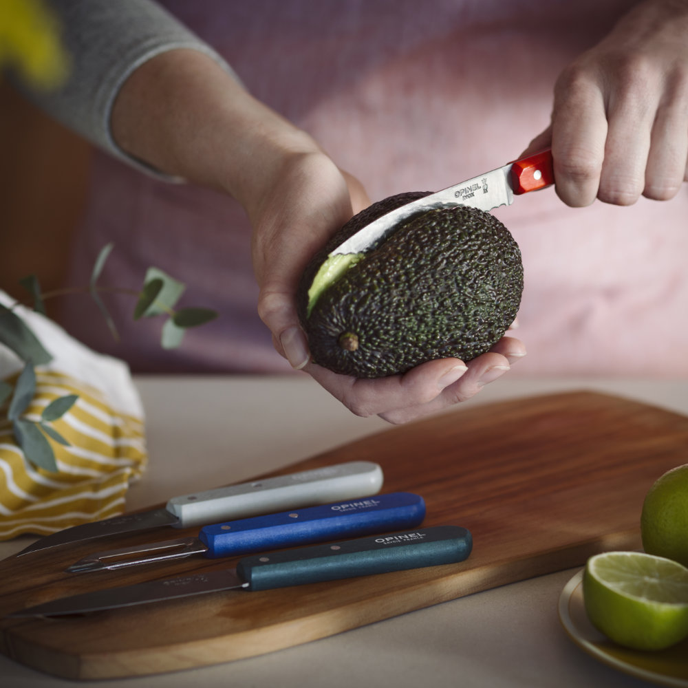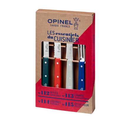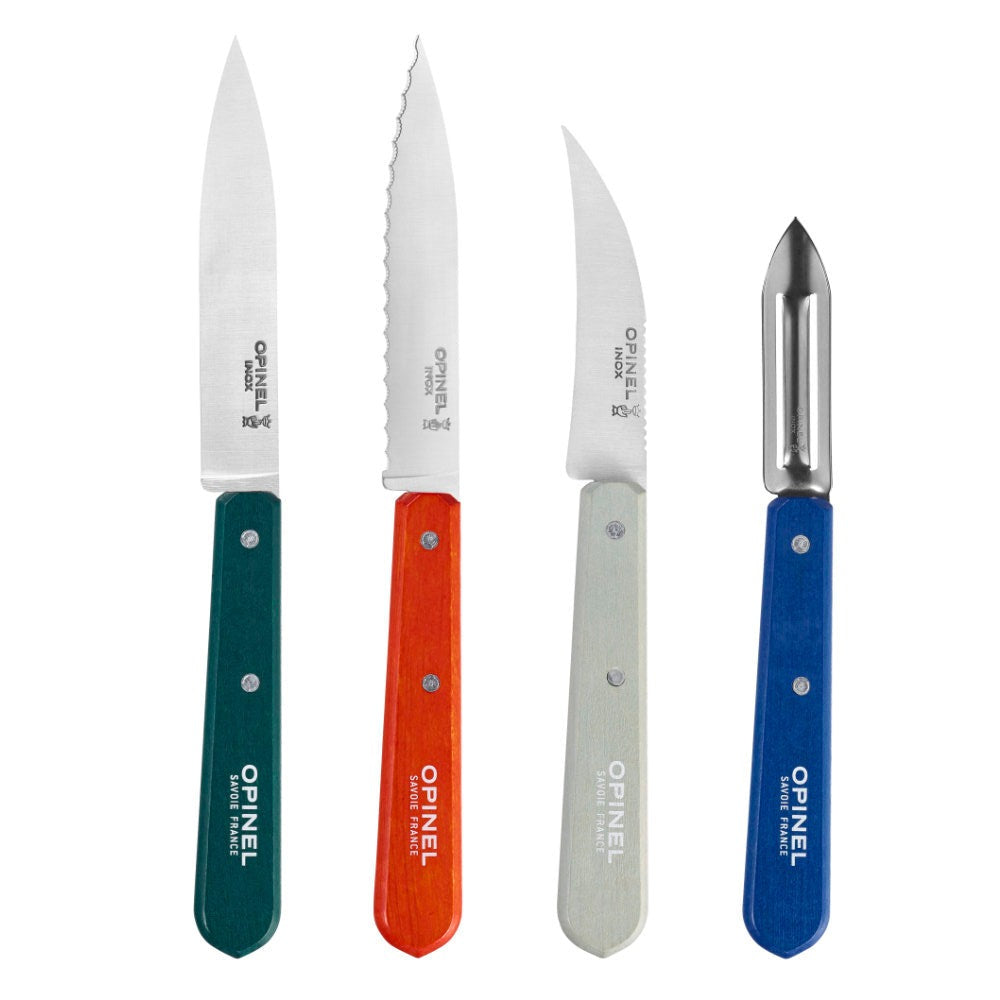The Opinel Essential Small Kitchen Knife Set has 4 small prep must-haves that make an excellent and colorful addition to any kitchen. The set includes a paring knife, serrated paring knife, bird's beak vegetable knife and stationary peeler.