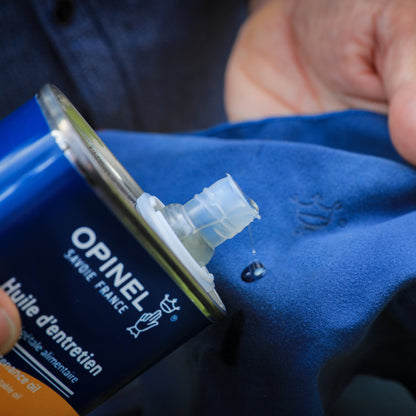 To condition Opinel wood handles, apply a few drops of oil to the microfiber cloth and rub them evenly.