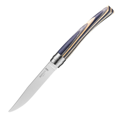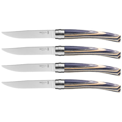 The Opinel Table Chic Laminated Birch Steak Knife Set includes 4 straight-edge steak knives with slender, comfortable handles made from graphic laminated birch wood from Finland. The straight edge blades have an elegant polish finish and slice cleanly for an optimal dining experience.