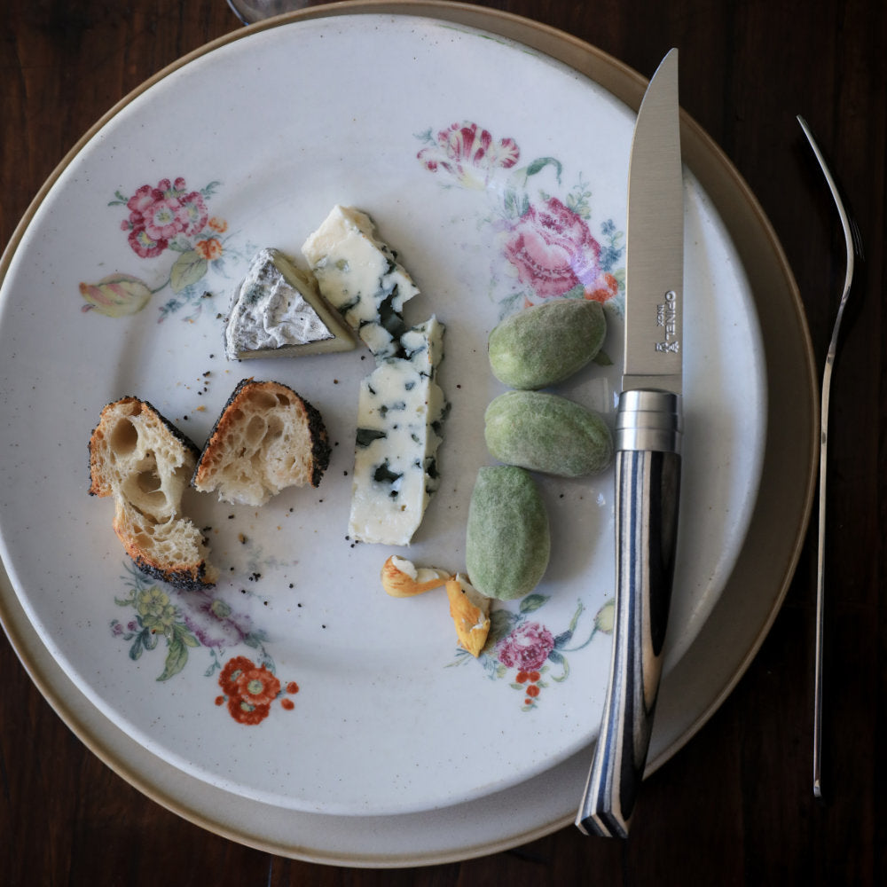 The bolsters of these knives are inspired by the Virobloc locking mechanisms of Opinel's iconic folding knives, and feature a flat surface to keep knives in place when set on the table.