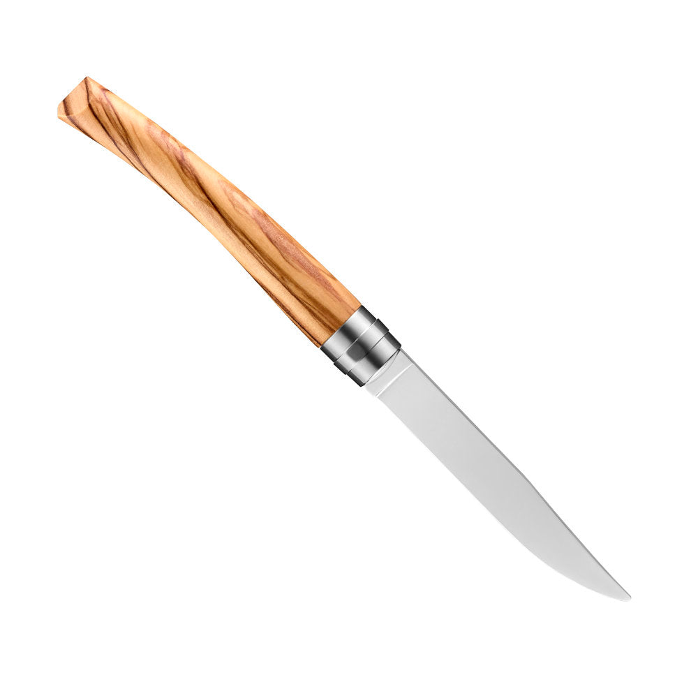 The Opinel Table Chic Olive Wood Steak Knife Set includes 4 straight-edge steak knives with slender, comfortable handles made from warm, beautiful Mediterranean olive wood. The straight edge blades have an elegant mirror finish and slice cleanly for an optimal dining experience.