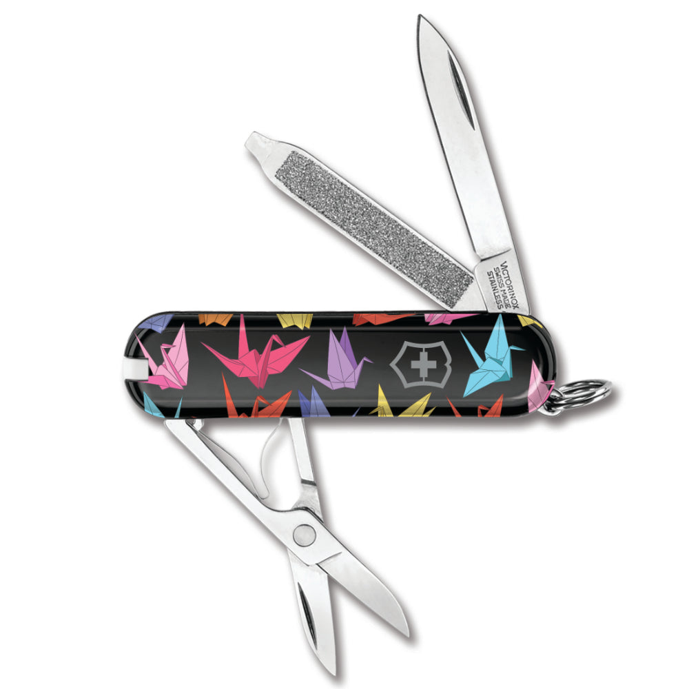The Origami Classic SD Swiss Army Knife by Victorinox is a Swiss Knife Shop Design Studio creation featuring a multitude of colorful origami cranes. The crane is the most well-known origami model in Japan, where legend has it that anyone who folds 1,000 of these graceful birds will be granted a wish. There is a small SKS logo on the back, as this knife was created by our SKS Design Studio.