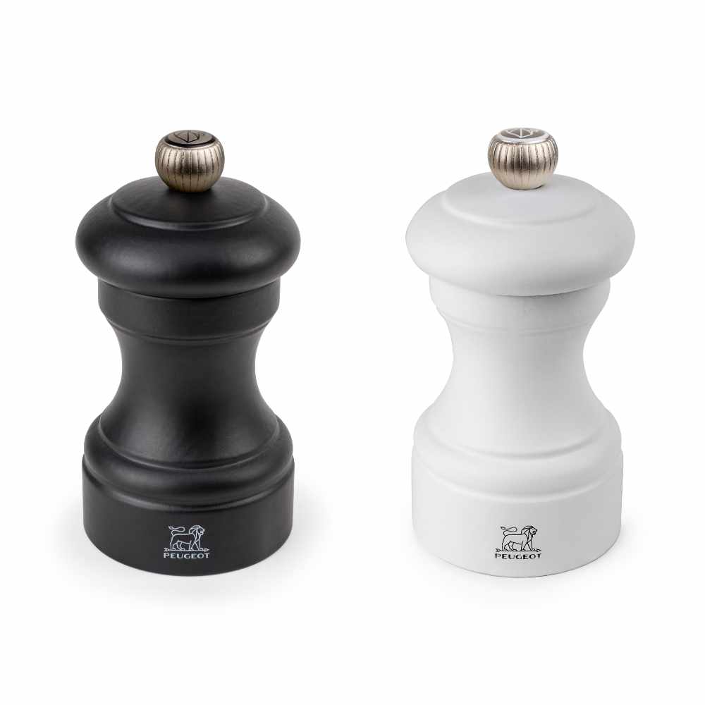 This set includes a Bistro Black Pepper Mill and a Bistro White Salt Mill. Each Bistro 4" Mill by Peugeot is made from sustainably-harvested French beech wood that is dried, turned and finished before the mill's final assembly. These classic, compact mills are the perfect size for any table - from dining room to kitchen.