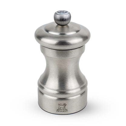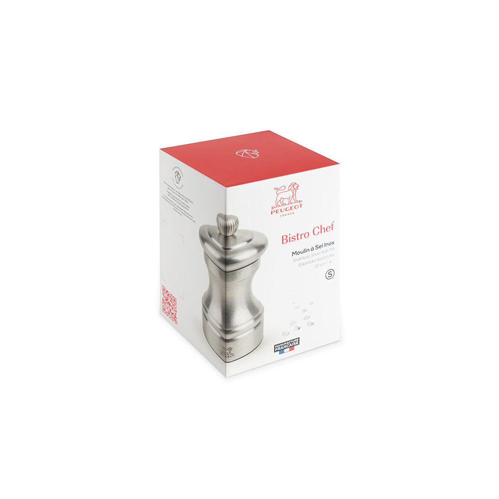 The Peugeot Bistro Chef 4" Salt Mill is a classic, compact mill with a beautiful, elegant, and durable brushed stainless steel body. This mill is the perfect size for any table - from dining room to kitchen.