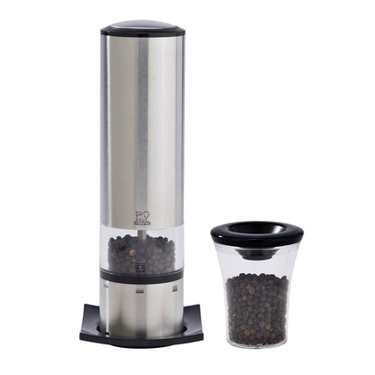 The Elis Sense 8" Soft Touch Electric Pepper Mill by Peugeot delivers perfectly ground pepper with the touch of a button. The pepper mill comes with a squared dish for storing and the pre-measured spice vial with funnel makes refilling a synch. The acrylic in the Elis Sense Pepper Mill is highly polished to avoid scratches and cloudiness, keeping it crystal clear for years to come.