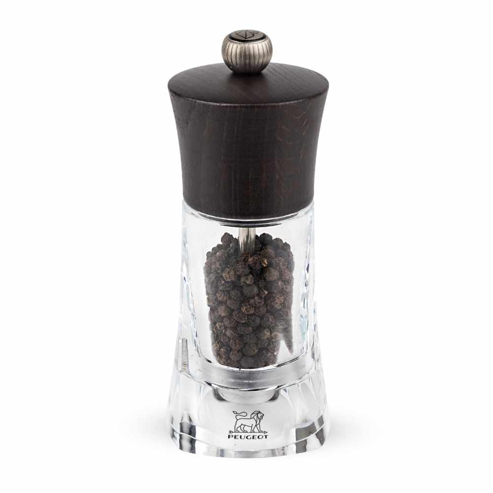 The Oleron 5.5" Beech Wood and Acrylic Pepper Mill by Peugeot is made from sustainably-harvested French beech wood and sparkling acrylic polished to prevent scratches and cloudiness. The beech wood is dried, turned, and finished before the mill's final assembly. This clean, contemporary mill with a rich chocolate finish is a nice addition to any table setting - from dining room to kitchen.
