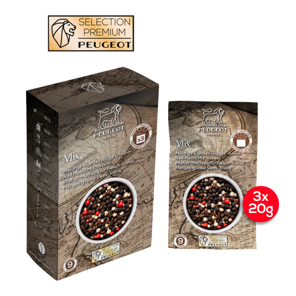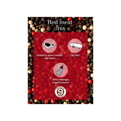 Peugeot Red Meat Blend Pepper is an aromatic pepper mix that adds flavor and depth to red meats, oily fish, red cabbage, lentils and legumes without overpowering them. It is a strong mix, with a flavor intensity of 9.