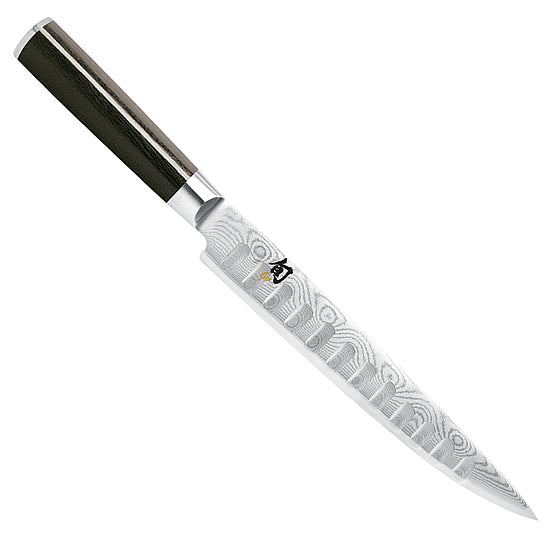 The Shun Classic 9-inch Slicing Knife features a long, thin blade with hollow-ground indentations and a razor-sharp edge. This combination yields a very clean cut, which improves the flavor of your roast or other meat by keeping the juices trapped where they belong. The hollow-ground indentations (also known as granton edge) on the blade reduce the friction between the blade and the food, allowing the blade to glide through meat, and also creating pockets of air so the knife releases the sliced food from the blade more easily.