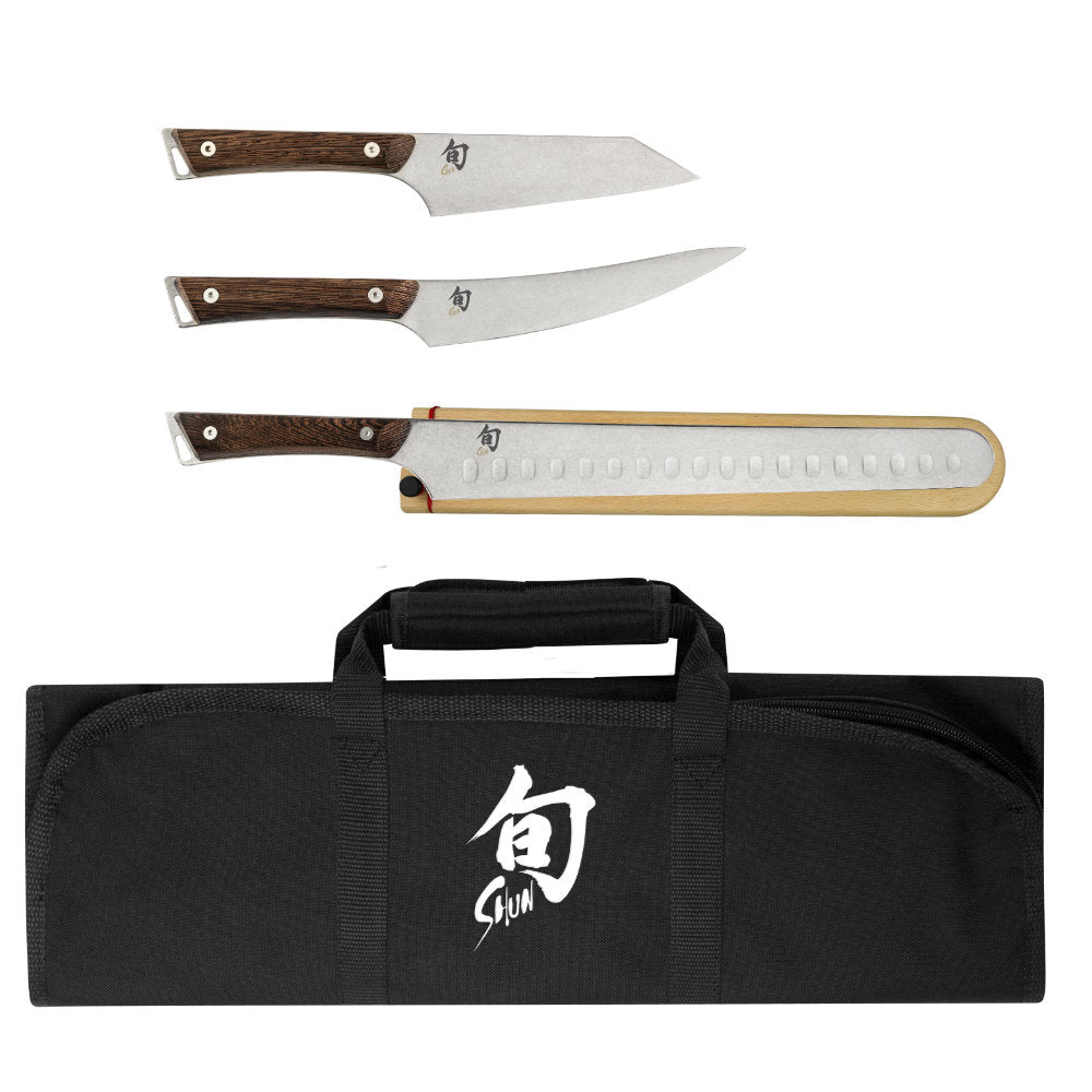 The Shun Kanso 4-piece BBQ Knife Set includes everything you need to tackle grilled proteins of any type - from fish to brisket, ham to turkey. The three included knives come in a Shun 8-slot knife roll with a handle and a detachable shoulder strap, making this BBQ kit easy to carry to your back deck or that BBQ competition you entered.