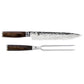 The Shun Premier Carving Set contains a a 9 1/2" carving knife and a 6 1/2" carving fork. This beautiful hand-hammered set has walnut-colored PakkaWood handles and are hand-crafted in Japan. This carving set will provide not only high performance for slicing and serving meats, from summer barbecues to a grand holiday roast, but its beauty will just add to the festivities!