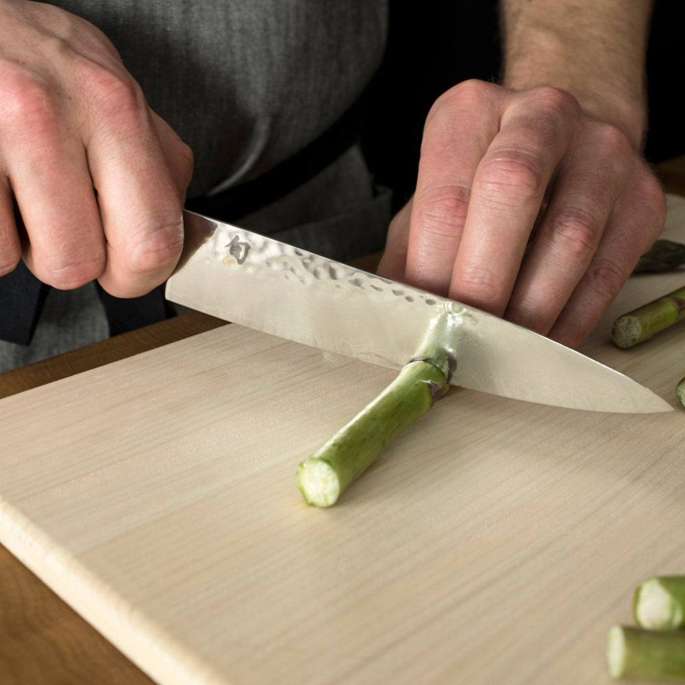 - Hammered "tsuchime" finish helps release food easily when cutting
