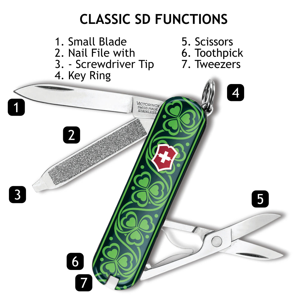 The Celtic Classic SD Limited Edition Swiss Army Knife by Victorinox is a Swiss Knife Shop exclusive showcasing a beautiful shamrock Celtic Knot design - sure to please those who are Irish or even Irish at heart.