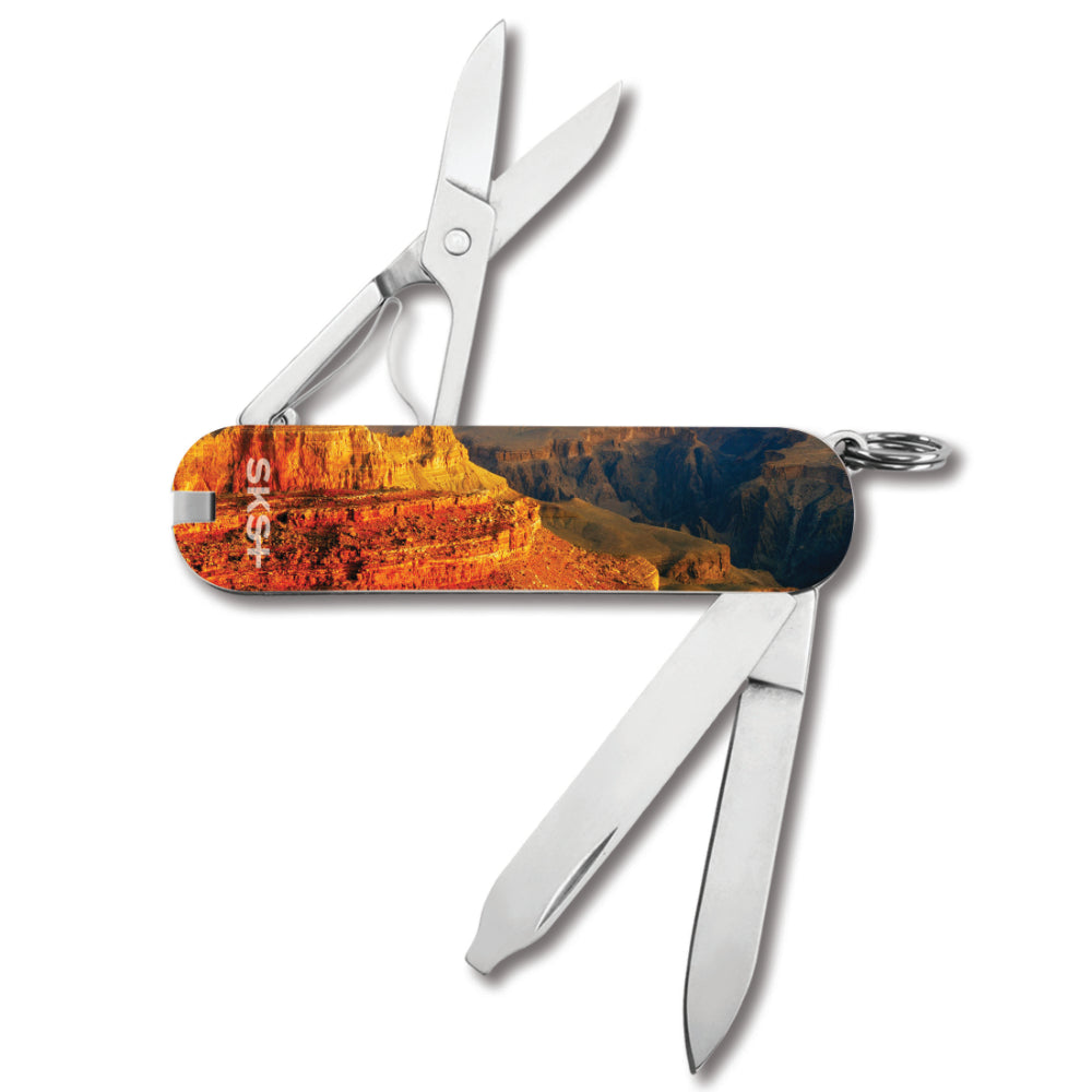 The Grand Canyon Classic SD Swiss Army Knife by Victorinox is a Swiss Knife Shop Design Studio creation featuring the unique landscape of this national landmark. Keep a piece of this steep-sided canyon carved by the Colorado River with you on your key chain.