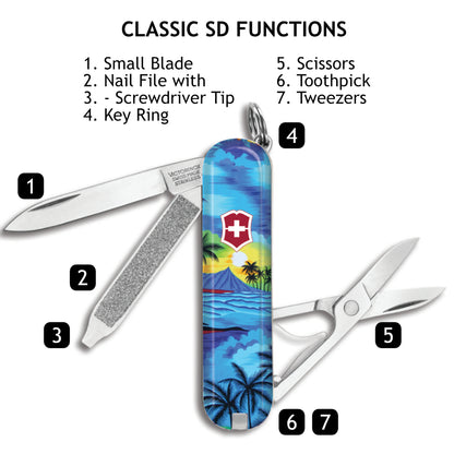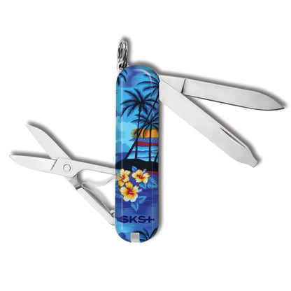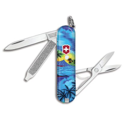The Hawaiian Shirt Classic SD Swiss Army Knife by Victorinox is a Swiss Knife Shop Design Studio creation celebrating the tropics. It is reminiscent of the quintessential Hawaiian shirt from palm trees to a volcano.