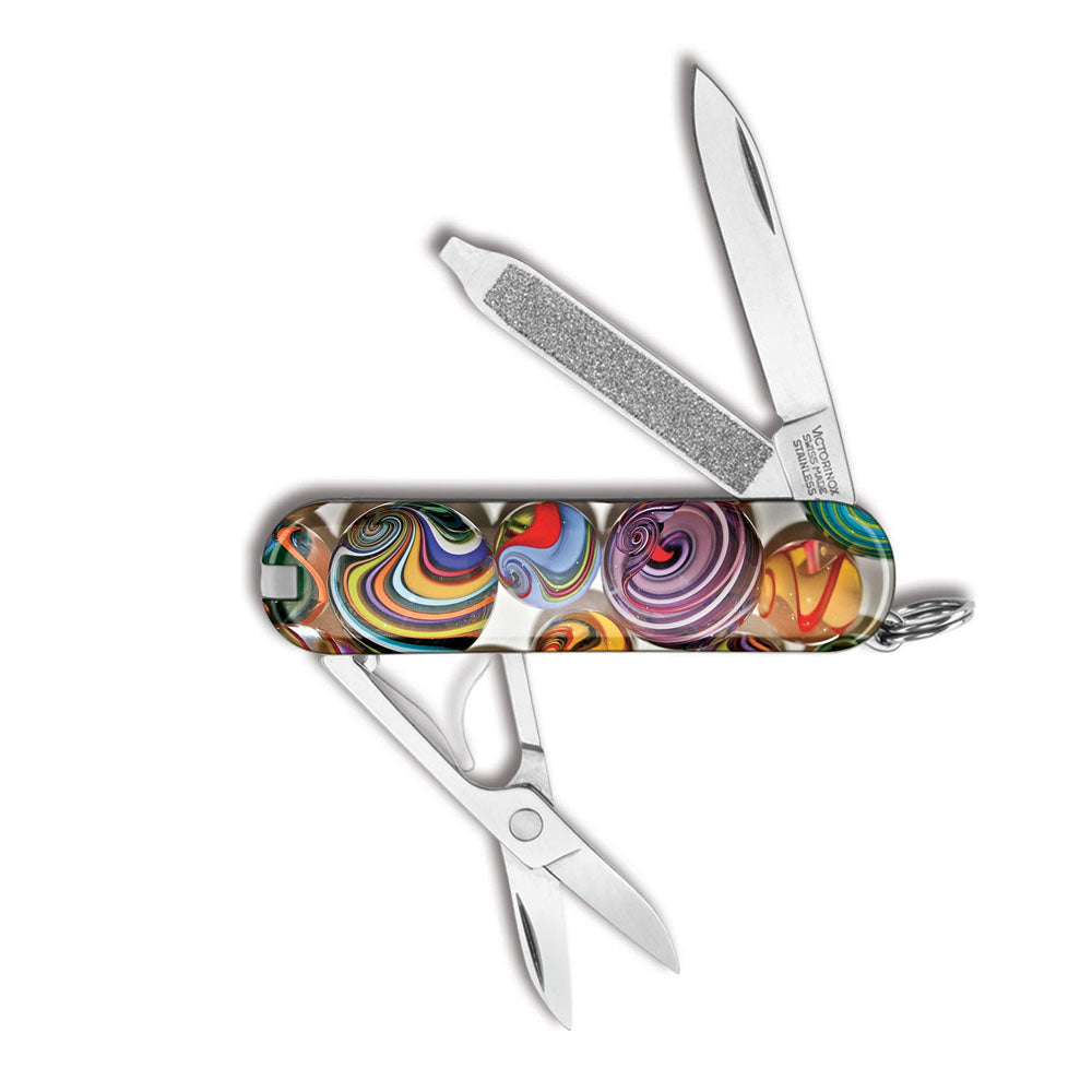 The Marbles Classic SD Swiss Army Knife by Victorinox is a Swiss Knife Shop Design Studio creation showcasing the beautiful, colorful hand crafted marbles of Fritz Glass on Cape Cod. A photo of Fritz's bright, swirling marbles is printed on a genuine Swiss Army Knife.