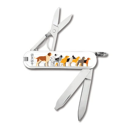 The Victorinox Puppy Parade Classic SD Swiss Army Knife is a Swiss Knife Shop Design Studio creation celebrating dogs of all sizes and colors. The whimsical print on this unique Classic SD shows a lineup of dogs from a tiny Terrier to a mighty St. Bernard. There is a small SKS logo on the back, as this knife was created by our SKS Design Studio.