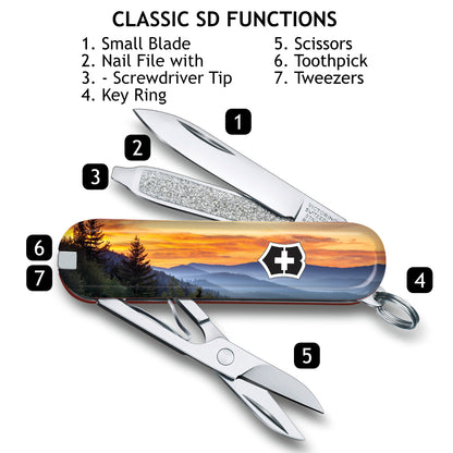 The Smoky Mountains Classic SD Swiss Army Knife by Victorinox is a Swiss Knife Shop Design Studio creation celebrating Great Smoky Mountains National Park, which straddles the border between North Carolina and Tennessee. Renowned for its incredible diversity of plant and animal life, this beautiful park is the most visited National Park in America. There is a small SKS logo on the back, as this knife was created by our SKS Design Studio.