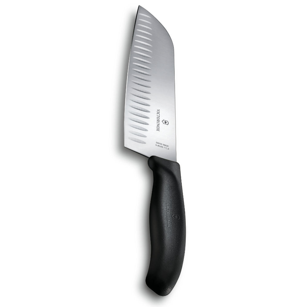 The Swiss Classic 7" Santoku Knife by Victorinox features the Santoku knife shape, which has become a favorite of chefs around the world. The knife's granton edge, or "kullenschiff" edge, has hollowed out grooves on the sides of the blade. These grooves fill with the fat and juices of the product being sliced, which allows for thin, even cuts without tearing or shredding the meat. The lightness of this knife and granton blade with a fluted edge make dicing, slicing, and mincing a breeze.