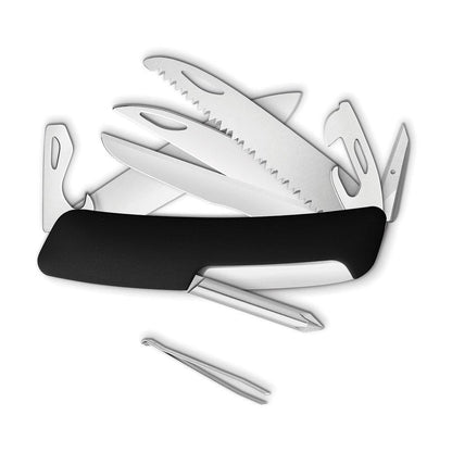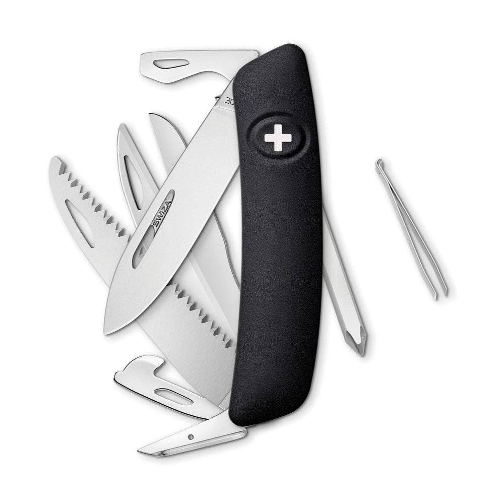 The Swiza D10 Black Swiss Pocket Knife is an authentic Swiss Knife with a unique new design created for those who want it all. The D10 is packed with functions, and features a long (2.95 inch), strong, locking stainless steel blade and 7 other implements housed in ergonomic, soft-touch handles.