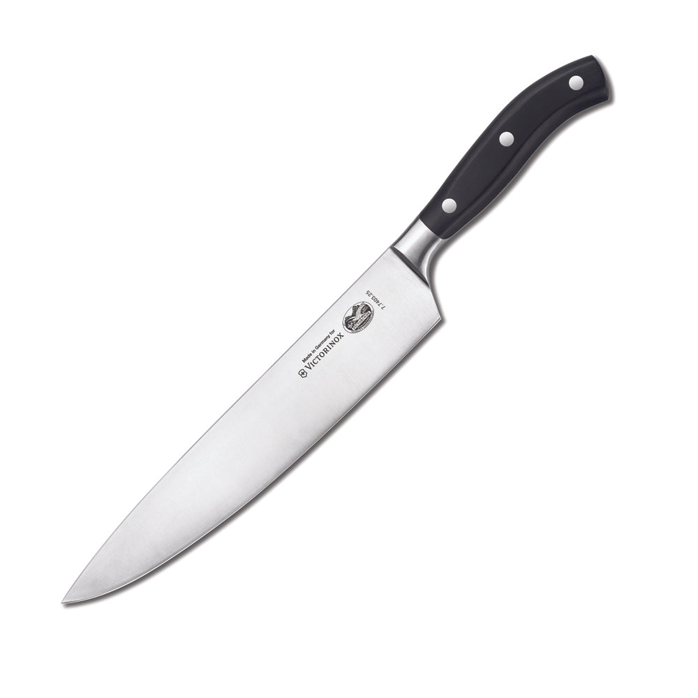 The Grand Maitre 10-inch Chef's Knife by Victorinox features an ultra-sharp straight-edged blade that is adept at almost any slicing, dicing or chopping task. You will reach for this knife every time you set to work in the kitchen. The curved blade allows for rocking, and the width of the knife from spine to blade keeps your knuckles comfortably above the cutting board as you work. The demi-bolster on this knife allows for uniform sharpening of the entire blade, and also makes this knife exceptionally comfortable when using it with a pinch grip.