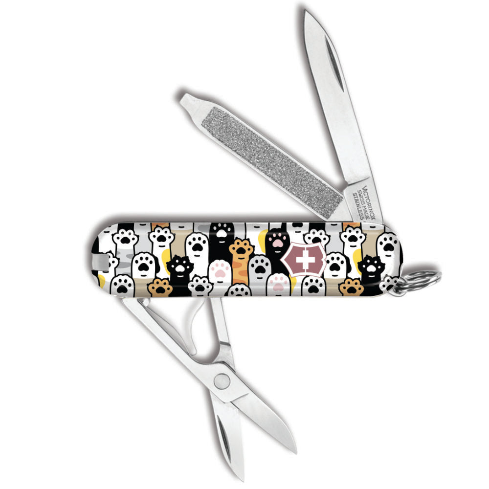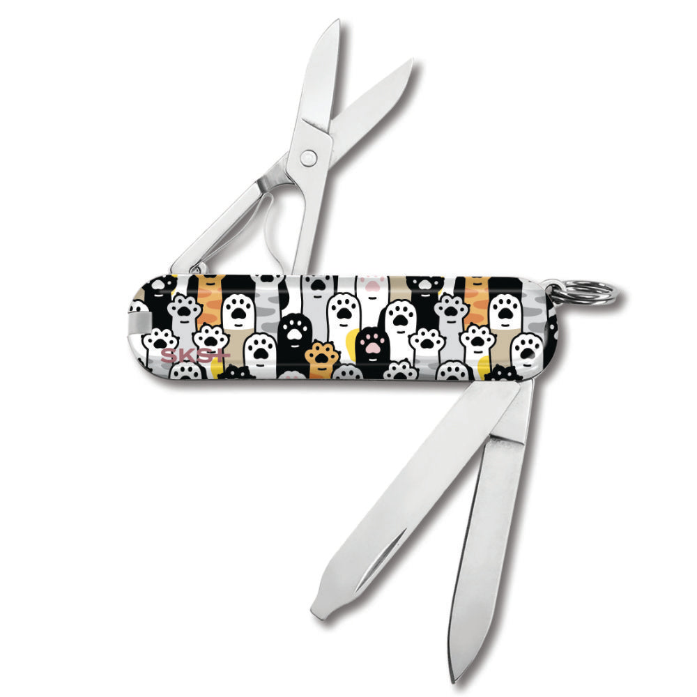 The Paws in the Air Classic SD Swiss Army Knife by Victorinox is a Swiss Knife Shop Design Studio creation featuring a collection of dog and cat paws raised, perhaps asking for more treats. There is a small SKS logo on the back, as this knife was created by our SKS Design Studio.