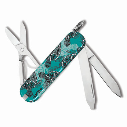 The Sea Turtles Classic SD Swiss Army Knife by Victorinox is a Swiss Knife Shop Design Studio creation featuring a bale of sea turtles. There is a small SKS logo on the back, as this knife was created by our SKS Design Studio.