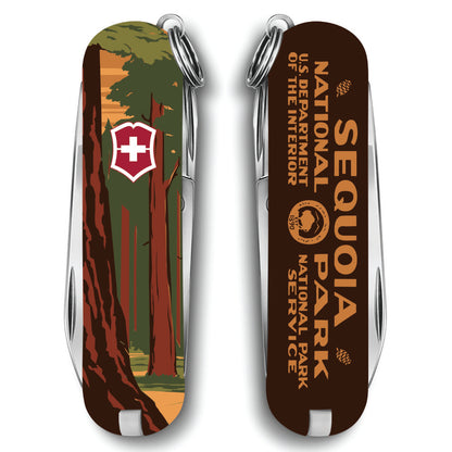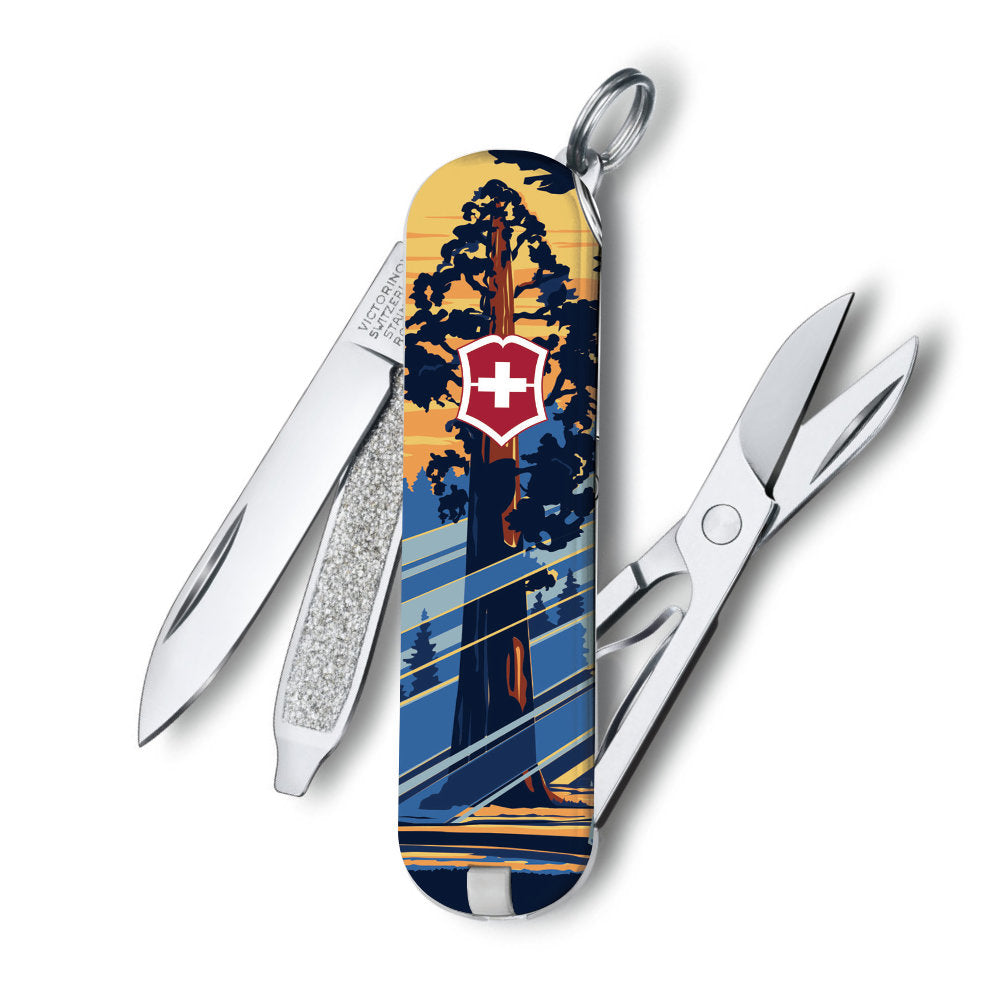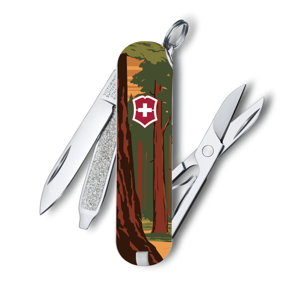 The Sequoia National Park Poster Art Classic SD Swiss Army Knife by Victorinox is a special edition Classic SD features the artwork of Doug Leen, AKA "Ranger of the Lost Art," who strives to educate people about the importance of nature conservation. A former Grand Teton National Park Ranger, Doug Leen created this unique silk-screen reproduction of the New Deal Era National Park poster for Sequoia Park in California.