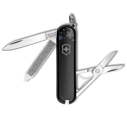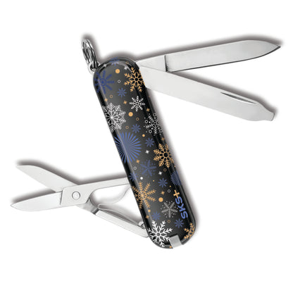 The Snow Flurries Classic SD Swiss Army Knife by Victorinox is a wintery Swiss Knife Shop Design Studio creation featuring a swirl of white blue and gold snowflakes on a black background. A small SKS logo on the back indicates that this design is only available at Swiss Knife Shop