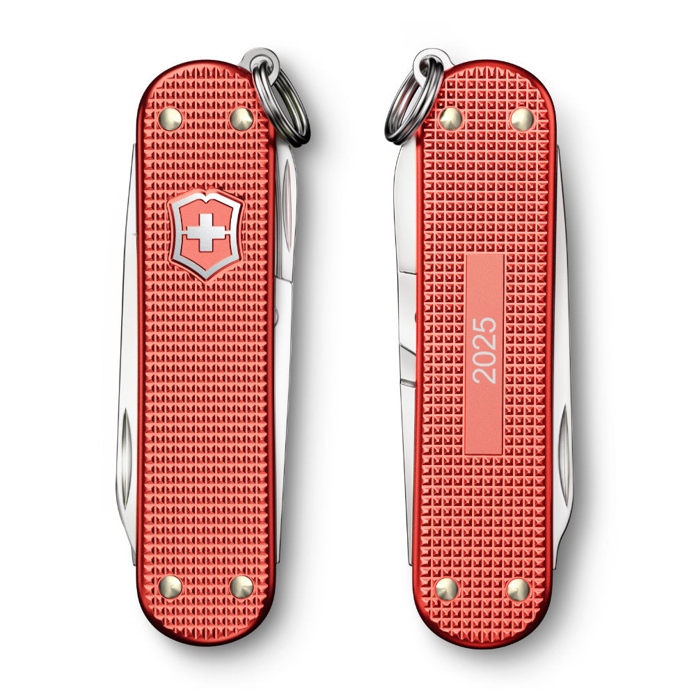 The back panel of this limited edition Classic SD is engraved with the year, 2025, and the tool is housed in a handsome presentation gift box featuring the Victorinox logo.
