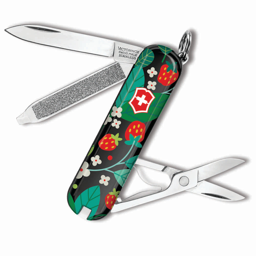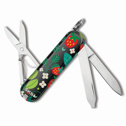 The Strawberry Patch Classic SD Swiss Army Knife by Victorinox is a Swiss Knife Shop Design Studio creation featuring a colorful field of strawberries and blossoms. There is a small SKS logo on the back, as this knife was created by our SKS Design Studio.