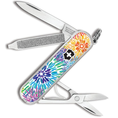 The Summer Blooms Classic SD Swiss Army Knife by Victorinox is a Swiss Knife Shop Design Studio creation featuring a bright burst of colors reminiscent of wildflowers in summer. There is a small SKS logo on the back, as this knife was created by our SKS Design Studio.