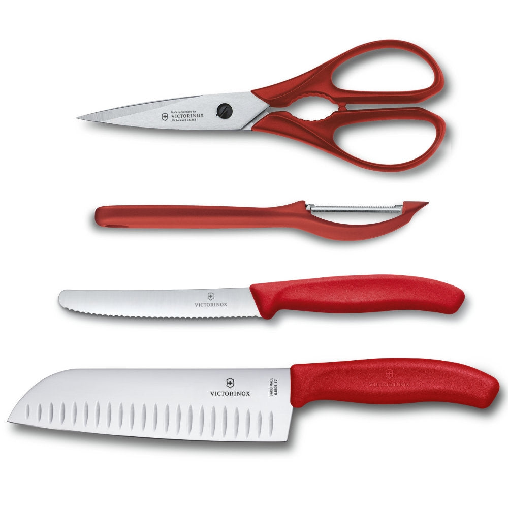 The 4-Piece Swiss Classic Kitchen Set by Victorinox includes four kitchen prep favorites: multi-purpose kitchen shears; a serrated double-edge universal peeler; a 4.5-inch utility knife; and a 7-inch Santoku knife.